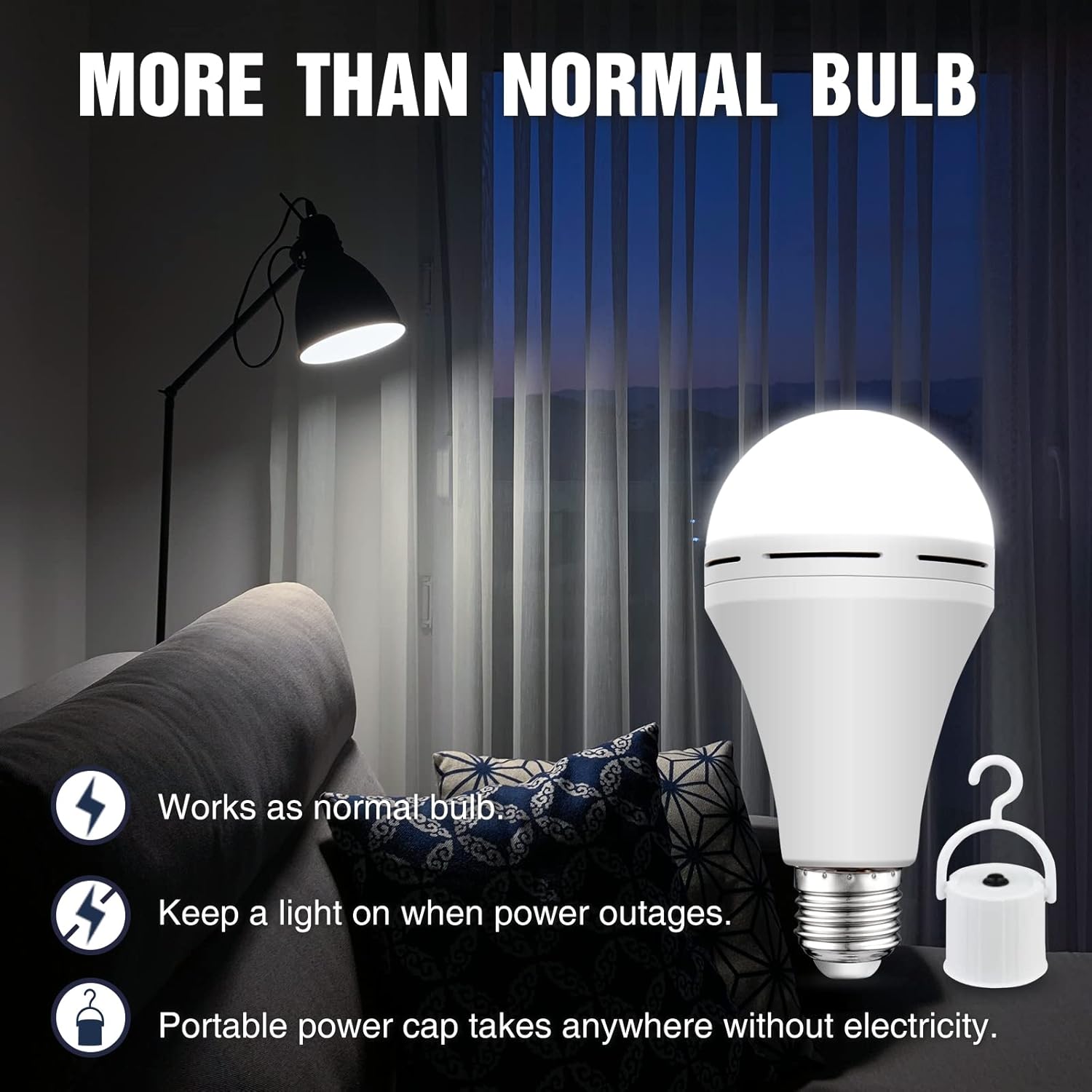 Neporal Rechargeable Light Bulbs Battery Operated Powered Backup Light Bulb, 15W 80W Equivalent 6000K 1200mAh, Emergency Light Bulb for Lamp Camping Works Even Power Outage -2 Packs + 2 Portable Hooks