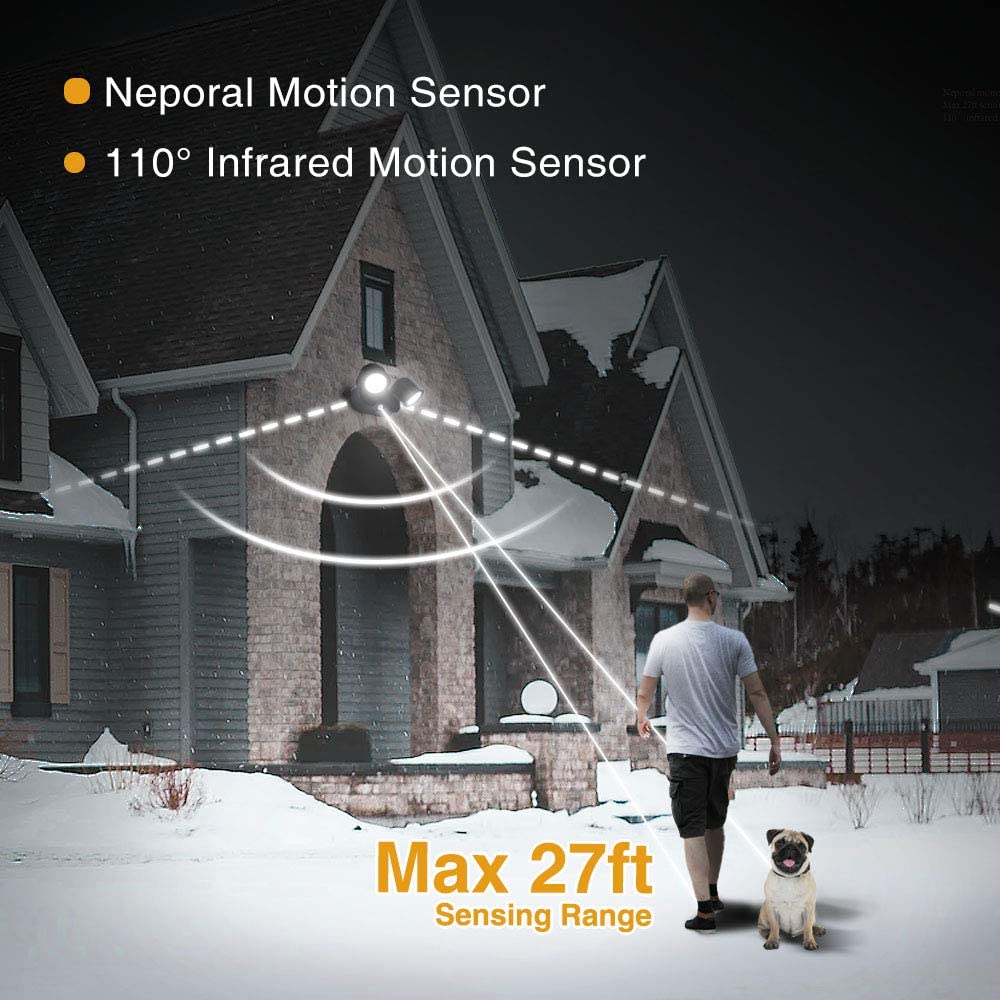 【All Weather Ready】The motion sensor security light is waterproof and heat-resistance, ready for all season and all temperature. No worried about the rainy. It can work perfectly even without sunlight. Wider use than solar light. (life-long warranty)